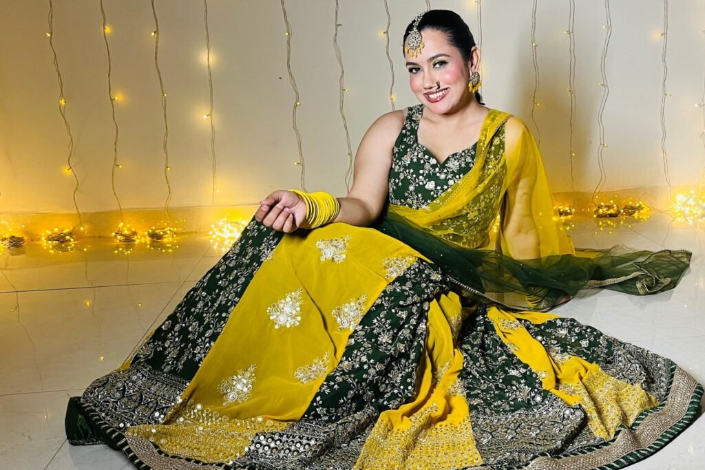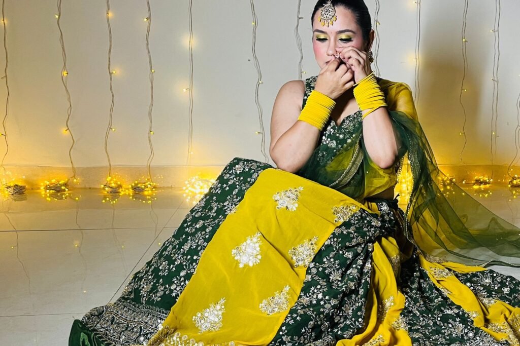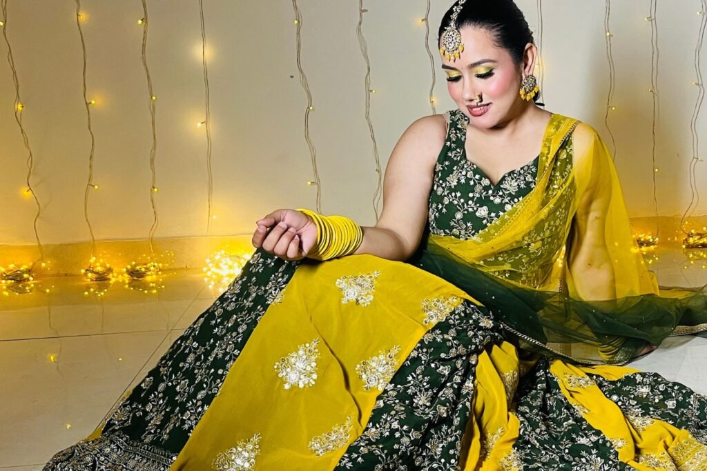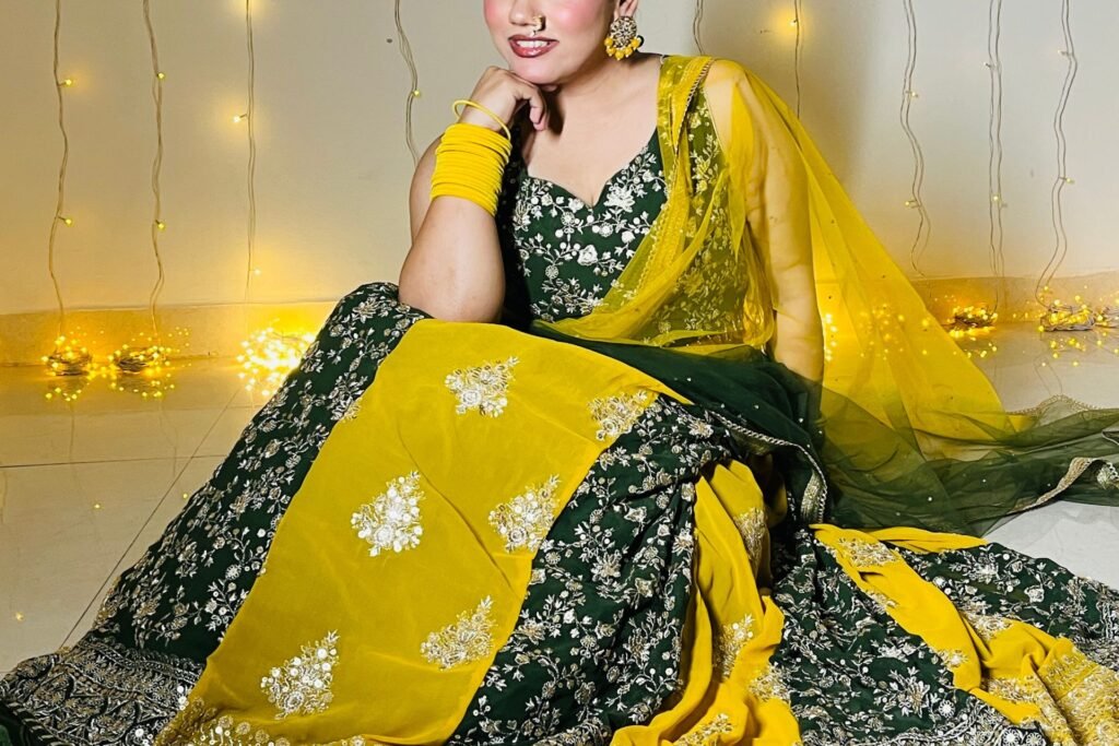 This Lehenga choli set is perfect for the Haldi look. Or one can wear this attire on any occasion. It is lightweight, and the size range is from SMALL to LARGE. The colour of the Lehenga is yellow and green with a net dupatta. If you need the matching jewellery (earrings, mangtikka, bangles), we will provide you as shown in the images. Price: INR 10,000. Sale Price: INR 6000 (with jewellery). INR 5000 (without Jewellery).